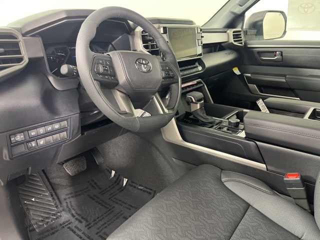 SR5 Premium Package (8-Way Power-Adjustable Heated Front Seats, Automatic Power Tailgate with Easy Closing, and SofTex Seat Trim), TRD 20" Matte Black Wheel Package (TMS) (PPO), 18" Alloy Wheels, 3.31 Axle Ratio, 4-Wheel Disc Brakes, 9 Speakers, ABS brakes, Air Conditioning, All Weather Floor Liners (TMS), Alloy wheels, AM/FM radio: SiriusXM, Apple CarPlay/Android Auto, Auto High-beam Headlights, Automatic temperature control, Brake assist, Bumpers: body-color, Delay-off headlights, Driver door bin, Driver vanity mirror, Dual front impact airbags, Dual front side impact airbags, Electronic Stability Control, Emergency communication system: Safety Connect (10-year trial), Exterior Parking Camera Rear, Fabric Seat Trim (FB), Front anti-roll bar, Front Bucket Seats, Front Center Armrest, Front fog lights, Front reading lights, Front wheel independent suspension, Fully automatic headlights, Heated door mirrors, Heated Leather Steering Wheel, Illuminated entry, Knee airbag, Low tire pressure warning, Occupant sensing airbag, Outside temperature display, Overhead airbag, Overhead console, Panic alarm, Passenger door bin, Passenger vanity mirror, Power door mirrors, Power driver seat, Power steering, Power windows, Radio data system, Radio: Audio Multimedia System, Rear reading lights, Rear step bumper, Rear window defroster, Remote keyless entry, Safety Connect, Security system, Speed control, Speed-sensing steering, Split folding rear seat, Stainless Steel Door Edge Guards (TMS), Steering wheel mounted audio controls, Tachometer, Telescoping steering wheel, Tilt steering wheel, Traction control, Trip computer, Variably intermittent wipers, and Voltmeter.0040 2025 Toyota Tundra SR5 4D CrewMax 3.4L V6 17/22 City/Highway MPG 10-Speed Automatic 4WD
