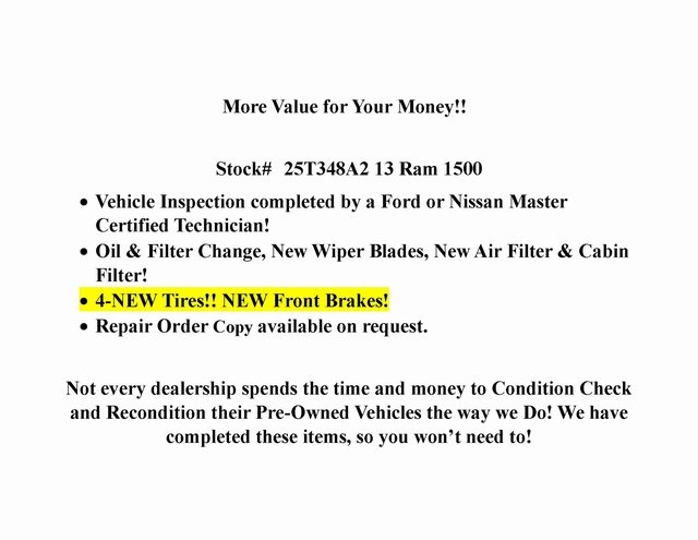 Clean CARFAX. Sport HEMI 5.7L V8 Multi Displacement VVT Green Light Inspected and Reconditioned, 3.92 Rear Axle Ratio, 9 Amplified Speakers w/Subwoofer, Air Conditioning ATC w/Dual Zone Control, Leather steering wheel, Panic alarm, ParkView Rear Back-Up Camera, Quick Order Package 25L Sport (DISC), Sport Premium Group.Odometer is 63384 miles below market average!Awards: * Motor Trend Truck of the Year * Ward's 10 Best Engines * NACTOY 2013 North American Truck of the YearReviews: * If you've been searching for a rugged full-size truck that packs the latest in in-vehicle entertainment along with best-in-class fuel economy, the 2013 Ram 1500 should be at the top of your list. Source: [link] * Supple ride and composed handling; eight-speed transmission; impressive base V6 engine; refined cabin; impressive tech features and controls. Source: Edmunds