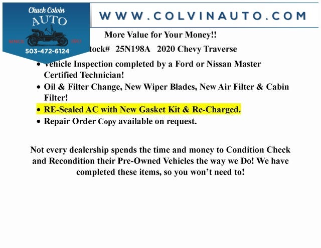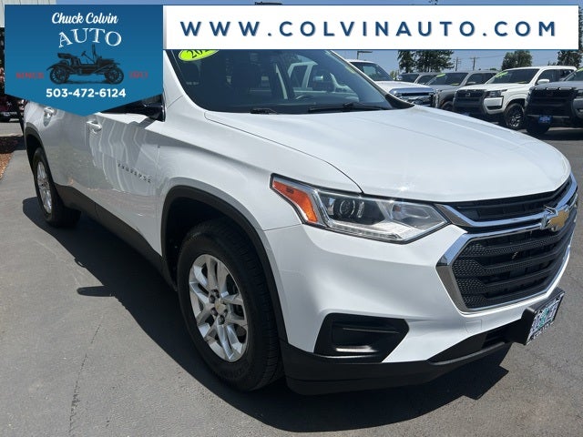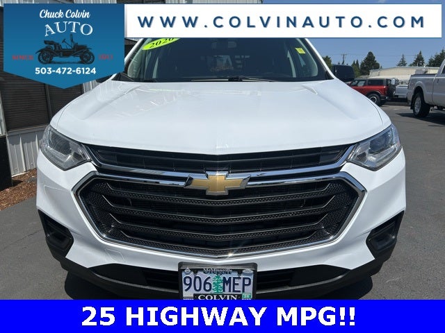 Clean CARFAX. LS 3.6L V6 SIDI VVT 2020 Chevrolet Traverse, Green Light Inspected and Reconditioned, Chuck Colvin Auto Center In Business Since 1911!, ONSTAR SERVICES, 3RD ROW SEAT, APPLE CAR PLAY, KEYLESS START, KEYLESS ENTRY, TEEN DRIVER, REAR CAMERA, 8 PASSENGER, AWD.Odometer is 18205 miles below market average!***High Quality New & Used Cars, Trucks and SUVs for sale near me at Chuck Colvin Ford Nissan! Dealership serving McMinnville, Portland, Salem, Hillsboro, Beaverton, Vancouver WA & surrounding areas. Call [phone] to schedule a test drive today!*** Green Light Inspected and Reconditioned,*** Chuck Colvin Ford & Nissan In Business Since 1911!.