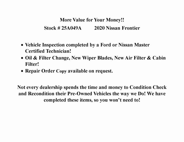 *** CARFAX One-Owner!!*** SV 3.8L V6 *** LOW MILES!! *** 2020 Nissan Frontier, Chuck Colvin Ford & Nissan In Business Since 1911!, 4WD, 2 Additional Speakers, Auto-Dimming Mirror w/Compass & Temperature, Dual Zone Automatic Air Conditioning, Fog Lamps, Heated Front Seats, Rear Sonar, Sliding Bed Extender, Spray-In Bedliner, Trailer Hitch, Utili-Track System, Value Truck Package, Vehicle Security System (VSS).***High Quality New & Used Cars, Trucks and SUVs for sale near me at Chuck Colvin Ford Nissan! Dealership serving McMinnville, Portland, Salem, Hillsboro, Beaverton, Vancouver WA & surrounding areas. Call [phone] to schedule a test drive today!*** Green Light Inspected and Reconditioned,*** Chuck Colvin Ford & Nissan In Business Since 1911!.