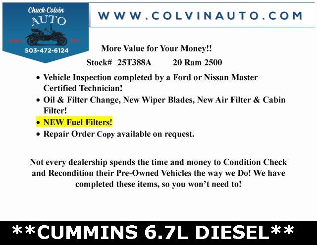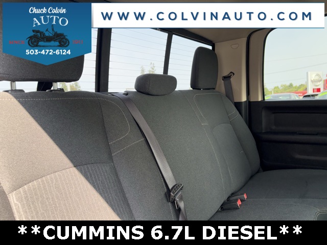 Tradesman Cummins 6.7L I6 Turbodiesel Green Light Inspected and Reconditioned, Cummins 6.7L I6 Turbodiesel, 4WD, 8.4" Touchscreen Display, Apple CarPlay, Bright Front Bumper, Bright Rear Bumper, Chrome Appearance Group, Chrome Grille Surround, Heated door mirrors, Matte Black Mesh Grille w/Chrome, ParkSense Rear Park Assist System, ParkView Rear Back-Up Camera, Power steering, Power windows, Protection Group, Quick Order Package 2HA Tradesman, Radio: Uconnect 3 w/5" Display, Radio: Uconnect 4 w/8.4" Display, Rear Folding Seat, Tradesman Level 2 Equipment Group, Wheels: 18" x 8.0" Steel Chrome Clad.Odometer is 21086 miles below market average!***High Quality New & Used Cars, Trucks and SUVs for sale near me at Chuck Colvin Ford Nissan! Dealership serving McMinnville, Portland, Salem, Hillsboro, Beaverton, Vancouver WA & surrounding areas. Call [phone] to schedule a test drive today!*** Green Light Inspected and Reconditioned,*** Chuck Colvin Ford & Nissan In Business Since 1911!.Awards: * Motor Trend Automobiles of the year