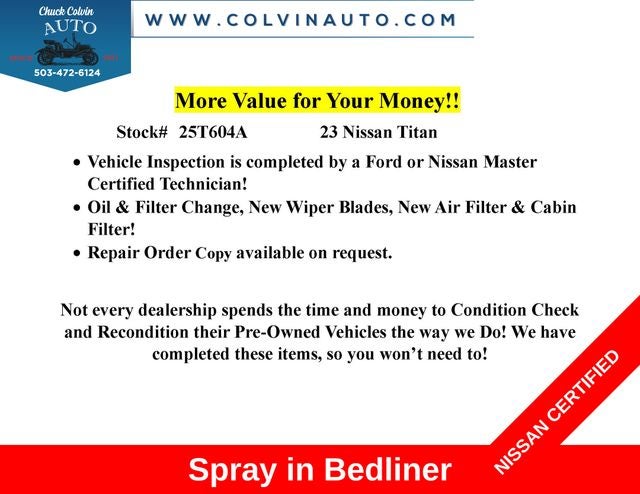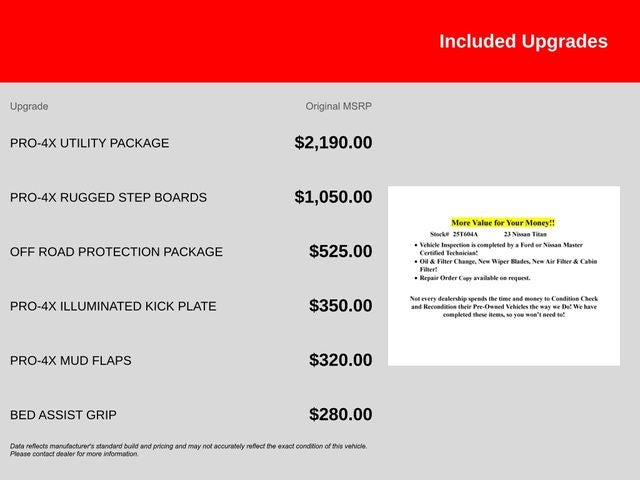 Experience the Unparalleled Capability and Versatility of the 2023 Nissan Titan PRO-4XThis 2023 Nissan Titan PRO-4X is a true workhorse, designed to conquer any terrain with its impressive performance and advanced off-road features. Powered by a robust 5.6L V8 DOHC 32V engine delivering 400 horsepower, this Titan is ready to take on your toughest tasks with ease. Paired with a 9-speed automatic transmission and a capable 4WD system, this truck offers exceptional handling and control, whether you're navigating the city streets or tackling rugged off-road trails.o Navigation System/GPSo Spray in Bedlinero Adaptive Cruiseo Blindspot Monitoro Smartphone Integrationo Backup Camerao Keyless Access w/ Pushbutton Starto Drowsiness Alerto Apple CarPlay/Android Autoo 120V Outlet in Bedo Utilitrack System w/4 Tie-Down Cleatso Power Sliding Rear Window w/Defoggero LED Tailgate Area Illuminationo LED Under Rail Bed Lightingo Fender Premium Audio System w/12 SpeakersThe Titan PRO-4X is equipped with a comprehensive Off-Road Protection Package, ensuring you're ready for any adventure. This package includes crew cab interior door scuff protection, an off-road adventure kit, an adventure medic kit, and Pro-4X high-wall floor liners, providing the ultimate in rugged protection.Nissan's commitment to quality and safety is evident in this Titan PRO-4X. With a 167-point inspection, roadside assistance, a transferable warranty, and a comprehensive vehicle history report, you can purchase this vehicle with confidence. The 84-month/100,000-mile limited warranty, 24/7 hour roadside assistance, and 1-year pre-paid maintenance further demonstrate Nissan's dedication to your satisfaction.Don't miss the opportunity to experience the unparalleled capability and versatility of the 2023 Nissan Titan PRO-4X. This truck is ready to take on any challenge, whether you're hauling heavy loads, traversing rugged terrain, or simply enjoying the open road. Contact us today to schedule a test drive and see why the Titan PRO-4X is the ultimate choice for your next adventure.Sales Tax, Title, License Fee, Registration Fee, $250 Dealer Document Fee are additional to the listed price and may be added to the sale price or capitalized cost. All vehicles are subject to prior sale. Please contact the Sales Team to confirm the availability and pricing of all vehicles.