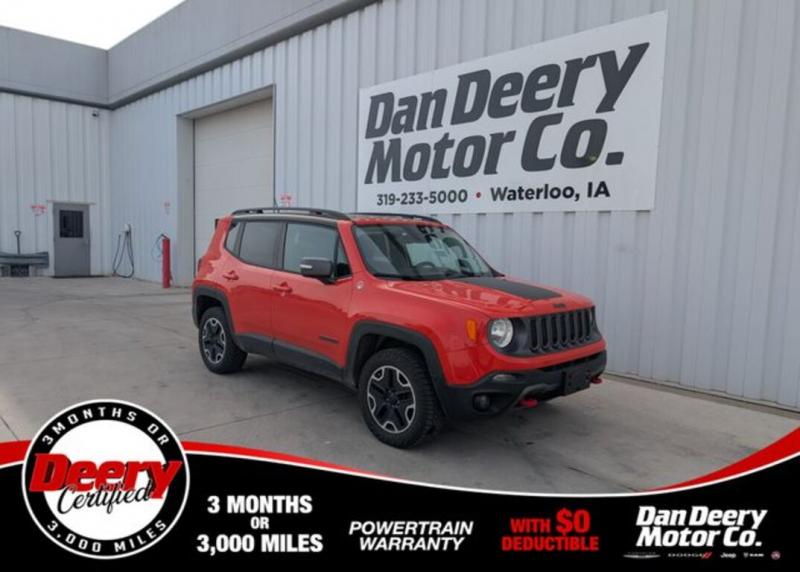 This Renegade is a local trade on a brand new Wrangler! It's a great option for the budget, with lower miles and giving you heated leather seats, 4x4, remote start, and affordable payment options! LOCAL TRADE, DEERY CERTIFIED, HEATED SEATS, HEATED STEERING WHEEL, LEATHER, 4X4, DUAL CLIMATE CONTROL, REMOTE START, CRUISE CONTROL, BLUETOOTH, POWER SEAT, POWER WINDOWS, POWER LOCKS, BACK-UP CAMERA, ALUMINUM/ALLOY WHEELS, GREAT PAYMENT OPTIONS, GAS SAVER, CLEAN AUTOCHECK, VISIT [link] program details: Deery Certified Pre-Owned Details. *$0 Deductible ** 3 Months or 3,000 Miles (whichever comes first ) ** Systems Covered - Gasoline/ Diesel Engine , Transmission , Drive Axle, Hybrid Components , Filters, Lubricants & Taxes and Seals and Gaskets ** See Dealer for More Information. Recent Arrival! Odometer is 33552 miles below market average! 21/29 City/Highway MPGCertification Program Details: 3 month / 3,000 miles Awards: * 2017 [link] 10 Best All-Wheel-Drive Vehicles Under $25,000 * 2017 [link] 10 Coolest New Cars Under $18,000 * 2017 [link] 10 Most Awarded BrandsServing the Cedar Valley Area for 3 Generations as one of MIDWEST'S LARGEST DEALER GROUPS including Cedar Rapids, Dubuque, Iowa City, Des Moines, West Des Moines, Davenport, Clinton, Urbandale, Marion, Marshalltown, Mason City, Fort Dodge, Ankeny, Waterloo, Ames, Burlington, Quad Cities, Waukee, Johnston & Muscatine.