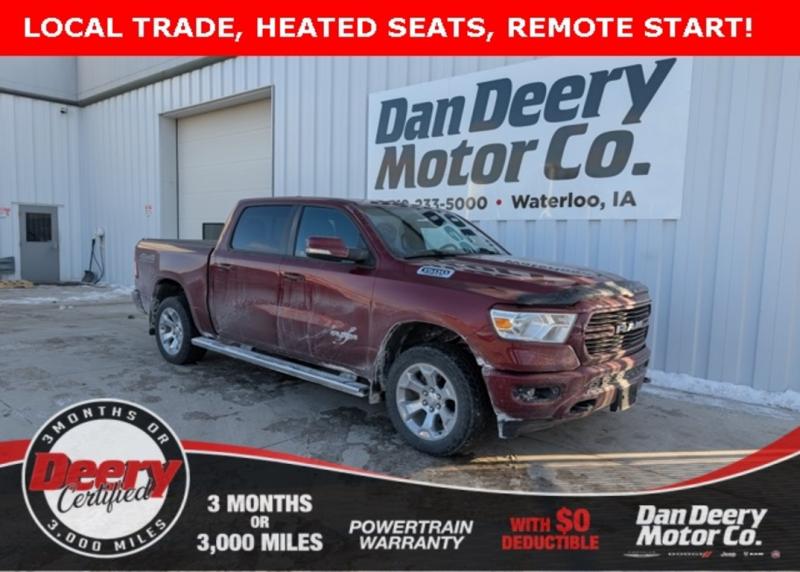 This Ram is a local trade on a brand new Ram! It's loaded up with heated seats, remote start, and the tires are in great shape. It's also well below the market average for mileage!LOCAL TRADE, DEERY CERTIFIED, HEATED SEATS, HEATED STEERING WHEEL, 4X4, DUAL CLIMATE CONTROL, RUNNING BOARDS, BUCKET SEATS, V8 POWER, REMOTE START, PARK ASSIST, TOW PACKAGE, CRUISE CONTROL, BLUETOOTH, APPLE CARPLAY / ANDROID AUTO, POWER SEAT, POWER WINDOWS, POWER LOCKS, BACK-UP CAMERA, ALUMINUM/ALLOY WHEELS, ACCIDENT FREE, CLEAN AUTOCHECK, VISIT [link] program details: Deery Certified Pre-Owned Details. *$0 Deductible ** 3 Months or 3,000 Miles (whichever comes first ) ** Systems Covered - Gasoline/ Diesel Engine , Transmission , Drive Axle, Hybrid Components , Filters, Lubricants & Taxes and Seals and Gaskets ** See Dealer for More Information. Recent Arrival! Odometer is 11937 miles below market average!Certification Program Details: 3 month / 3,000 milesServing the Cedar Valley Area for 3 Generations as one of MIDWEST'S LARGEST DEALER GROUPS including Cedar Rapids, Dubuque, Iowa City, Des Moines, West Des Moines, Davenport, Clinton, Urbandale, Marion, Marshalltown, Mason City, Fort Dodge, Ankeny, Waterloo, Ames, Burlington, Quad Cities, Waukee, Johnston & Muscatine.