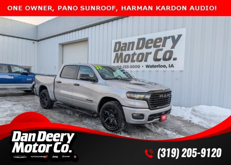 This Ram is a one owner, local trade from a very loyal dealership customer. They traded to upgrade to the new RHO! It's loaded with the upgraded panoramic sunroof, Level 2 Equipment group, and it had an original MSRP of $74,250!LOCAL TRADE, ONE OWNER, PANORAMIC SUNROOF, HEATED / COOLED SEATS, HEATED STEERING WHEEL, NAVIGATION, LEATHER, REMAINING FULL FACTORY WARRANTY, 4X4, BLIND SPOT DETECTION, ADAPTIVE CRUISE CONTROL, DUAL CLIMATE CONTROL, WIRELESS CHARGER, RUNNING BOARDS, BUCKET SEATS, HARMAN KARDON SOUND, REMOTE START, PARK ASSIST, TOW PACKAGE, CRUISE CONTROL, BLUETOOTH, APPLE CARPLAY / ANDROID AUTO, POWER SEAT, POWER WINDOWS, POWER LOCKS, BACK-UP CAMERA, ALUMINUM/ALLOY WHEELS, GREAT PAYMENT OPTIONS, ACCIDENT FREE, CLEAN AUTOCHECK, VISIT [link] the Cedar Valley Area for 3 Generations as one of MIDWEST'S LARGEST DEALER GROUPS including Cedar Rapids, Dubuque, Iowa City, Des Moines, West Des Moines, Davenport, Clinton, Urbandale, Marion, Marshalltown, Mason City, Fort Dodge, Ankeny, Waterloo, Ames, Burlington, Quad Cities, Waukee, Johnston & Muscatine. Recent Arrival!Awards: * Motor Trend Automobiles of the year