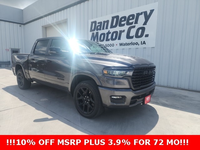 Factory MSRP: $72,905 $16,026 off MSRP! 1500 Laramie, 3.0L I6, 4WD, Granite Crystal Metallic Clearcoat. New Price! We are proud to sell and service your new Ram at Dan Deery Motors in Waterloo. We pride ourselves in transparent pricing and great customer service. Please contact our Sales staff to confirm you qualify for the rebates listed on our website as they can vary based on where you live. Granite Crystal Metallic Clearcoat Ram 1500 4D Crew Cab Laramie 3.0L I6 17/24 City/Highway MPG 8-Speed Automatic 4WD Awards: * Motor Trend Automobiles of the year Price includes all applicable incentives, some customers may not qualify: 10% Msrp - 2025 National 10% Below MSRP . Exp. 09/30/2025 $1,000 Trade Assist Rebate, must have trade 2008 or newer, good through May 31st 2025