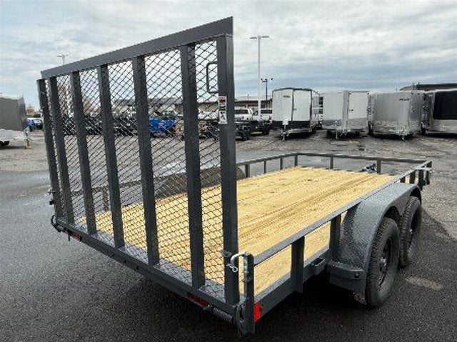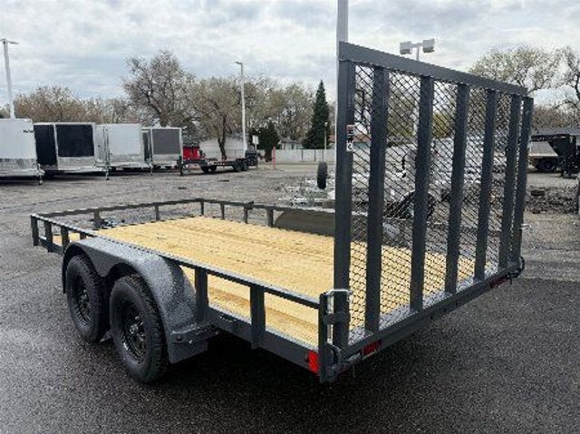 83X14 BUMPER PULL 3.5K EZ LUBE ELECTRIC BRAKE SPRING AXLE(S) 205/75 R15 (C) 6PLY TIRE WITH BLACK WHEEL SPARE TIRE MOUNT 2'' 10K DEMCO ADJ CAST COUPLER 2K TOP-WIND FLIP JACK WRAP TONGUE STRAIGHT DECK 4' SPRING ASSISTED LAY-DOWN GATE ROUND DIAMOND PLATE TEARDROP FENDERS STANDARD HEIGHT SIDE RAILS 2'' X 2'' ANGLE TOPRAIL STANDARD STAKE POCKETS 4'' CHANNEL FRAME 24'' CENTER-TO-CENTER CROSSMEMBERS TREATED YELLOW PINE FLOOR WIRING LED PACKAGE DECAL PACKAGE LAMAR GRAY POWDER COAT 7000 GVWR
