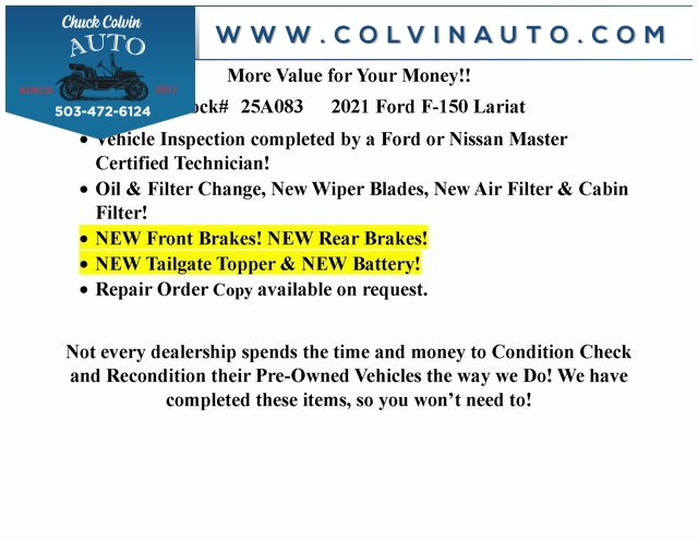 *** Clean CARFAX *** Lariat 5.0L V8! *** 2021 Ford F-150 *** Green Light Inspected and Reconditioned, Chuck Colvin Ford & Nissan In Business Since 1911!, LARIAT CHROME PACKAGE, 360 DEGREE CAMERA, POWER TAILGATE, INTERIOR WORK PACKAGE, PRO PACKAGE ONBOARD 2KW, 5.0L ENGINE, FORD CO-PILOT360 ASSIST 2.0, B&O SOUND, 4WD.***High Quality New & Used Cars, Trucks and SUVs for sale near me at Chuck Colvin Ford Nissan! Dealership serving McMinnville, Portland, Salem, Hillsboro, Beaverton, Vancouver WA & surrounding areas. Call [phone] to schedule a test drive today!*** Green Light Inspected and Reconditioned,*** Chuck Colvin Ford & Nissan In Business Since 1911!.Awards: * NACTOY 2021 North American Truck of the Year