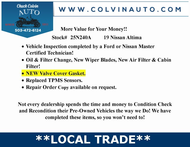 Clean CARFAX. 2.5 SV 2.5L 4-Cylinder DOHC 16V Green Light Inspected and Reconditioned, Sunroof, SV PACKAGE, CVT with Xtronic, Blind Spot Warning, Front Bucket Seats, Heated Front Bucket Seats, Heated front seats, Outside temperature display, Power moonroof, Remote keyless entry, Security system.Odometer is 19678 miles below market average!28/39 City/Highway MPGAwards: * JD Power Automotive Performance, Execution and Layout (APEAL) Study * 2019 [link] 10 Best All-Wheel-Drive Vehicles Under $30,000 * 2019 [link] 10 Most Comfortable Cars Under $30,000 * 2019 [link] 10 Best Sedans Under $30,000