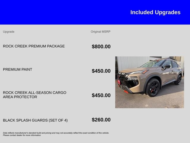 Sale Price is After the Following Factory Incentives:$2500 - Nissan Customer Cash. Exp. 01/05/2026 Baja Storm Metallic 2026 Nissan Rogue Rock Creek AWD CVT with Xtronic 1.5L DOHC 2026 Nissan Rogue, Chuck Colvin Auto Center In Business Since 1911!, AWD, 4-Way Power Passenger Seat, Auto-Dimming Inside Mirror, Heated Steering Wheel, Interior LED Accent Lighting, Memory Driver Seat & Outside Mirrors, Motion-Activated Power Liftgate, Reverse Tilt-Down Outside Mirrors, Rock Creek Premium Package, Wireless Charging Pad.Family owned and operated since 1911. We have developed a loyal dedicated following based on our unique approach to business. All the information you need, up front, with no hassles! Every effort is made by dealer to ensure accurate pricing, however mistakes can occur by human error or data feed error. Please verify all pricing with dealer prior to purchase as dealership not required to honor any price posted in error by human error or typo or by data feed error from one of our many digital partners. * Pricing - All vehicle pricing shown is assumed to be correct and accurate. Incentives, credit restrictions, qualifying programs, residency, and fees may raise, lower, or otherwise augment monthly payments. Additionally, incentives offered by the manufacturer are subject to change and may fluctuate or differ based on region and other considerations. Unless otherwise noted or specified, pricing shown does not include title, registration, or tax fees and costs. 27/32 City/Highway MPG