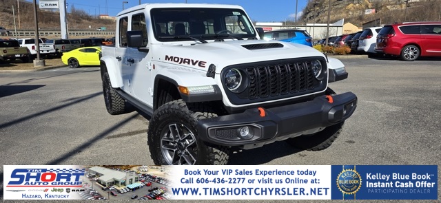 bright white clearcoat 2026 Jeep Gladiator Mojave 4WD 8-Speed Automatic 3.6L V6 24V VVT Convenience Group, Heated Front Seats, Heated Steering Wheel, Quick Order Package 24D Mojave, Remote Start System, Universal Garage Door Opener.Tim Short Chrysler Dodge Jeep Ram of Hazard KY is pumped up to offer this outstanding 2026 Jeep Gladiator in bright white clearcoat This vehicle has passed our comprehensive inspection and comes with the following features; Recent Arrival!Please feel free to explore our entire site and see all of our vehicles, learn about our many services, research our cars & trucks, and search our new Chrysler, Dodge, Jeep, RAM incentives. If you have any questions, drop us a line, give us a call, or drop by 270 Fitz Gilbert Rd Hazard, Kentucky. We hope to have the pleasure of meeting you soon. Take the SHORT drive to Satisfaction!!! Please visit us online at www.timshortchrysler.net or call us at [phone]!!