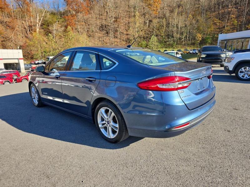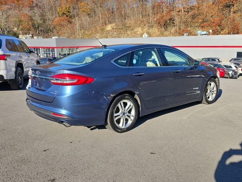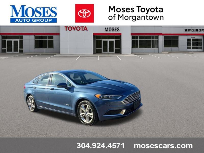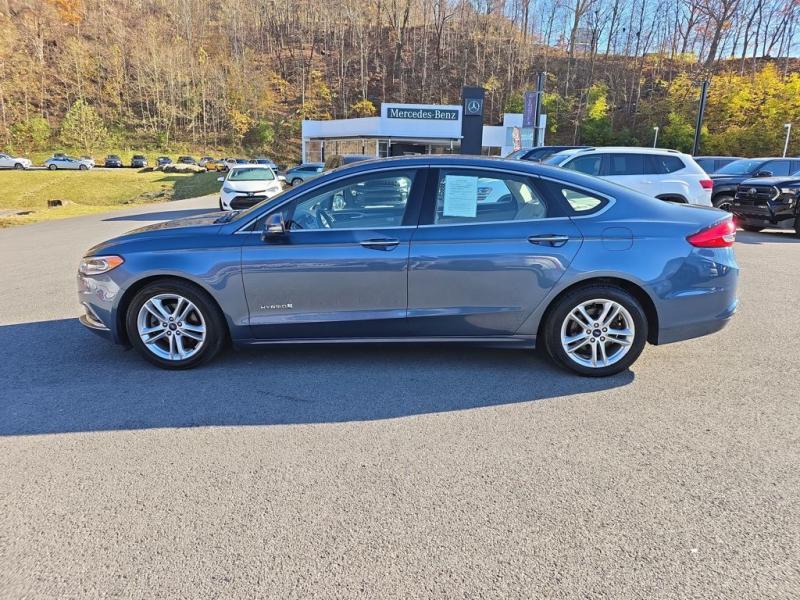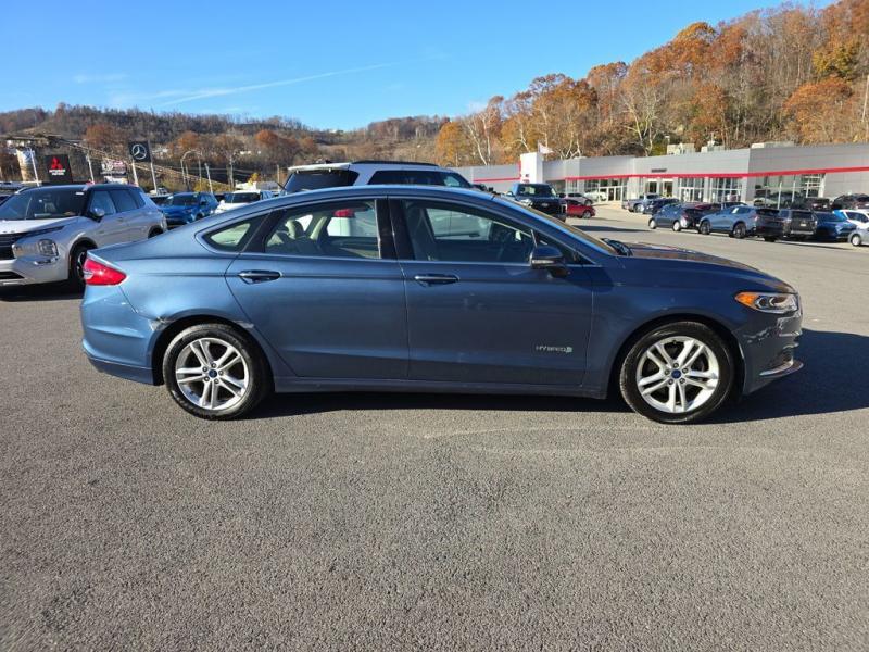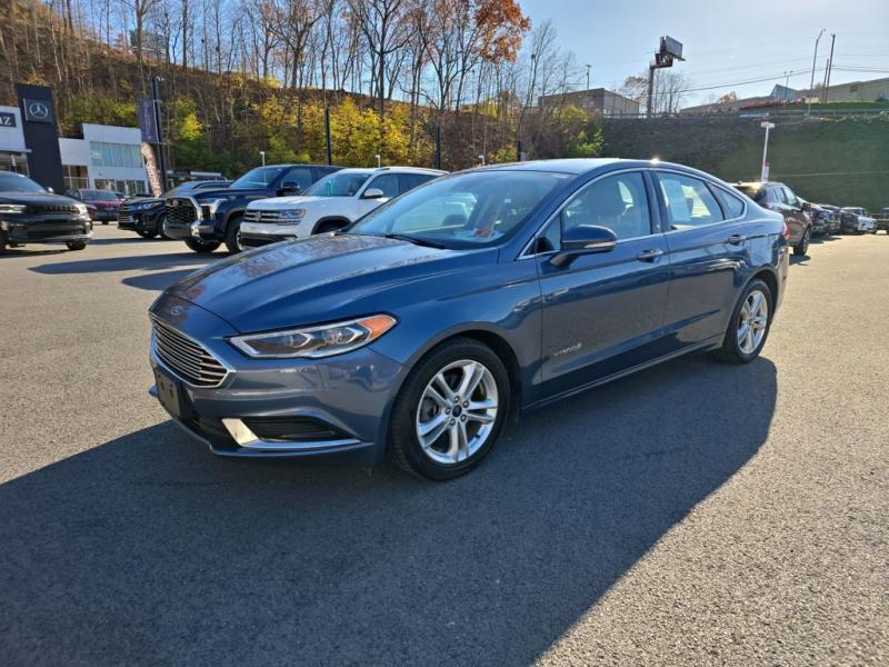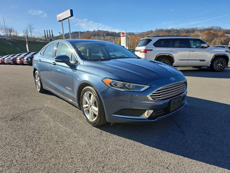 The 2018 Ford Fusion Hybrid SE in Blue Metallic stands out with its sleek, aerodynamic design and vibrant paint finish. The Blue Metallic color is a rich, deep tone that adds both elegance and sportiness to the sedan's modern profile. The SE trim features a bold chrome-accented front grille, projector-style halogen headlamps, LED signature lighting, and clean sculpted body lines. The streamlined roofline and subtly integrated rear spoiler give the Fusion a dynamic, sophisticated stance. Standard 17-inch alloy wheels and body-color side mirrors with integrated turn signals complete its polished look.Performance & EfficiencyEngine & Hybrid System: 2.0-liter Atkinson-cycle 4-cylinder engine paired with an electric motor. Combined system output is 188 horsepower.Transmission: Electronic Continuously Variable Transmission (eCVT) for smooth, seamless acceleration.Drive System: Front-wheel drive.Fuel Economy: Around 43 mpg city, 41 mpg highway, and 42 mpg combined--making it highly efficient for daily commuting and long-distance driving.Ride & Handling: Independent suspension with electric power-assisted steering provides a composed, comfortable, and quiet ride, with the hybrid system tuned for efficiency and smoothness.Interior & ComfortSeating: Cloth-trimmed seating for five, with 10-way power-adjustable driver's seat and power lumbar support. Heated front seats were optional.Space: Spacious cabin with supportive seating and good rear legroom. Trunk space is reduced slightly to accommodate the hybrid battery, but the split-folding rear seat helps maximize practicality.Technology: SYNC infotainment system with voice recognition, Bluetooth, USB port, and available SYNC 3 with an 8-inch touchscreen, Apple CarPlay, and Android Auto integration.Audio: Standard 6-speaker system, with optional premium upgrades [link] Dual-zone electronic automatic climate control, push-button start, rotary gear shift dial, and smart storage spaces throughout the cabin.Design Touches: Clean, modern dashboard layout with soft-touch materials and brushed-metal style accents for a refined look.Safety & Driver AssistanceThe 2018 Fusion Hybrid SE includes a strong suite of safety features, with available driver-assist technologies:Rearview camera with guidelinesAdvanceTrac electronic stability control with brake assistAnti-lock braking system (ABS)Front, side, curtain, and driver knee airbagsTire pressure monitoring systemAvailable Ford Co-Pilot360 features such as blind-spot monitoring, lane-keeping system, adaptive cruise control, and pre-collision assist with automatic emergency braking.SummaryThe 2018 Ford Fusion Hybrid SE in Blue Metallic combines sharp styling, excellent fuel economy, and a comfortable, feature-rich interior. Its hybrid powertrain offers smooth performance with impressive efficiency, while the SE trim adds a balance of convenience, technology, and comfort. The Blue Metallic exterior enhances its modern, upscale design, making it a standout midsize hybrid sedan that blends practicality with sophistication.