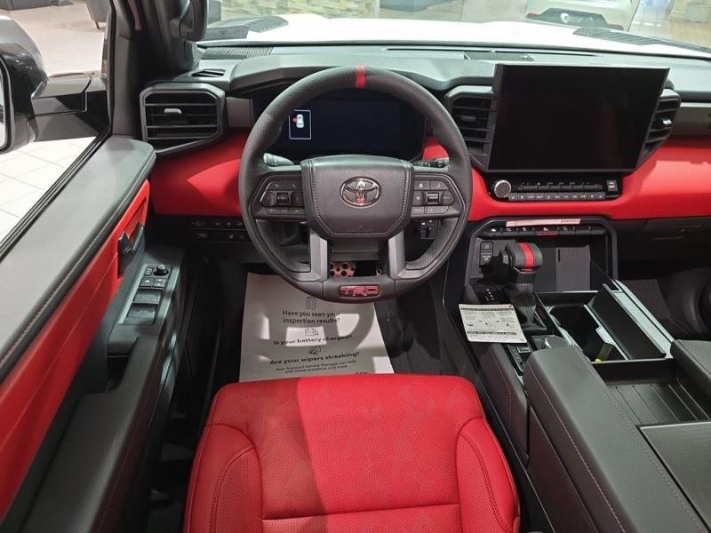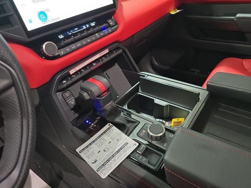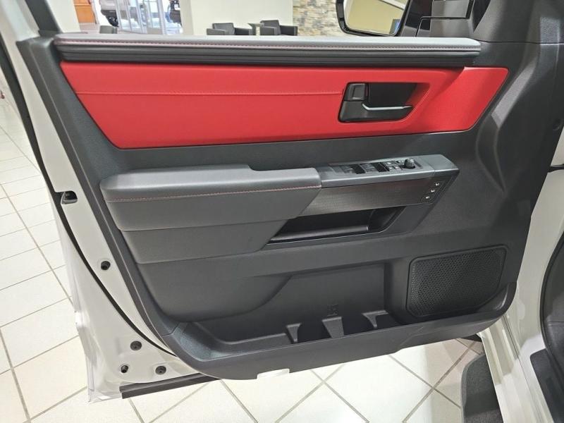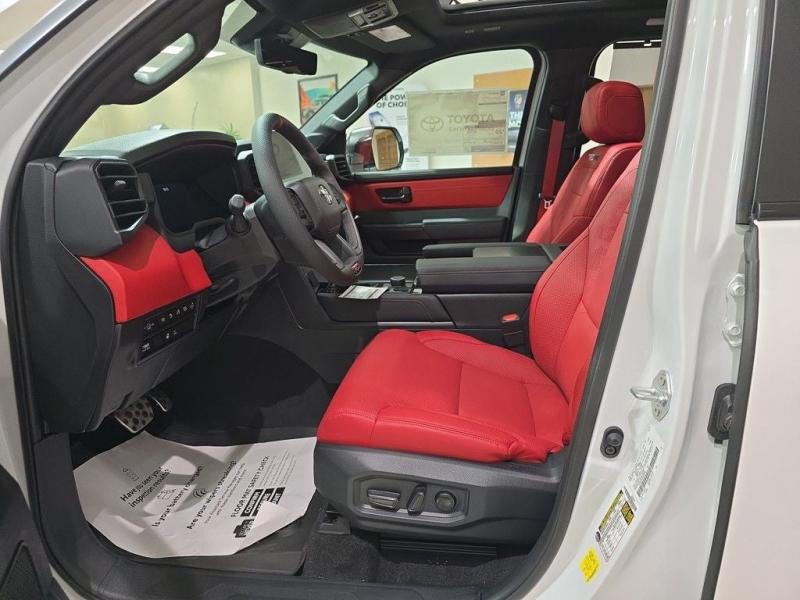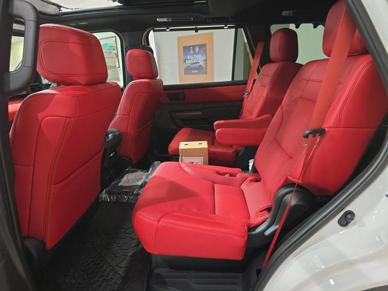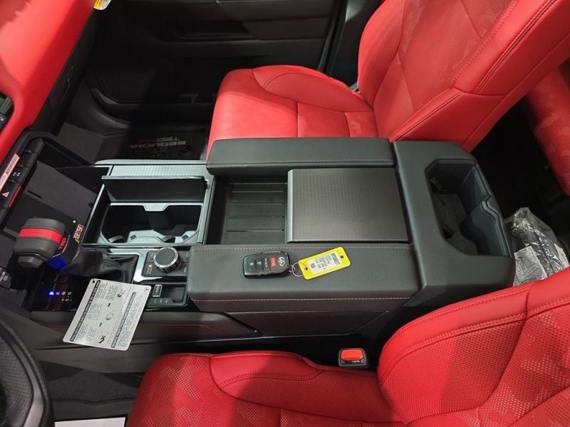 2025 Toyota Sequoia TRD Pro Ice Cap | Cockpit Red Interior | 4WD | Full-Size Power, Off-Road MasteryUncompromising capability meets aggressive styling and modern hybrid muscle. The 2025 Toyota Sequoia TRD Pro in striking Ice Cap White with bold Cockpit Red interior trim is the ultimate full-size SUV for thrill-seekers who demand rugged utility, cutting-edge tech, and head-turning design all wrapped in TRD-tuned performance and 4WD confidence. i-FORCE MAX Hybrid Powertrain + TRD Off-Road Engineering3.5L Twin-Turbo V6 Hybrid (i-FORCE MAX)Cranks out an impressive 437 horsepower and 583 lb-ft of torque10-Speed Automatic Transmission delivers power with precision and smoothness4-Wheel Drive (4WDR) with TRD-tuned FOX Internal Bypass Shocks, skid plates, and Multi-Terrain Select systemTrail-ready with Crawl Control, locking rear differential, and increased ground clearance Ice Cap Exterior Rugged EleganceThe Ice Cap White finish delivers a bold, clean look that stands out on any terrainSignature TOYOTA heritage grille, integrated LED light bar, black roof rails, and TRD PRO stamped skid plate complete the aggressive exterior18-inch black TRD alloy wheels wrapped in all-terrain tires provide performance and presence Cockpit Red Interior Sport Meets StyleExclusive Cockpit Red SofTex-trimmed seating with TRD logos and contrast stitchingHeated and ventilated front seats, power-folding third row, and captains chairs in the second rowRed interior accents, black dash trim, and a panoramic moonroof for an adventurous cabin experience Advanced Technology & Comfort14-inch Toyota Audio Multimedia touchscreen with wireless Apple CarPlay & Android AutoJBL Premium Audio system, 12.3-inch digital instrument cluster, and Head-Up DisplayQi wireless charging, multiple USB-C ports, and standard Wi-Fi Connect Safety That Goes the DistanceToyota Safety Sense 3.0:Pre-Collision System with Pedestrian DetectionLane Tracing Assist & Full-Speed Dynamic Radar Cruise ControlBlind Spot Monitor, Rear Cross-Traffic Alert, and Advanced Park AssistTowing capacity of up to 9,520 lbs, plus trailer sway control and integrated brake controller Why the 2025 Sequoia TRD Pro in Ice Cap with Cockpit Red?This is Toyotas most off-road capable and visually striking Sequoia yet. With hybrid power, full 4WD functionality, and a bold contrast between the Ice Cap exterior and Cockpit Red interior, this SUV is built for those who want luxury, space, and adventure-ready performance all in one uncompromising package.