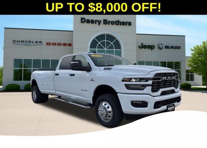 Big Horn Level 1 Plus Equipment Group (12' Touchscreen Display, 2 Way Rear Headrest Seat, 2nd Row in Floor Storage Bins, 4 Way Front Headrests, 40/20/40 Split Bench Seat, 4G LTE Wi-Fi Hot Spot, 9 Alpine Speakers with Subwoofer, Air Conditioning ATC with Dual Zone Control, Alexa Built-in, Apple CarPlay, Auto Power-Folding Mirrors, Auto-Dimming Rear-View Mirror, Black Exterior Mirrors, Cloth 40/20/40 Premium Bench Seat, Connected Travel and Traffic Services, Connectivity - US/Canada, Disassociated Touchscreen Display, Dual Glove Boxes, Emergency Vehicle Alert System (EVAS), Exterior Mirrors Courtesy Lamps, Exterior Mirrors with Heating Element, Exterior Mirrors with Supplemental Signals, Foam Bottle Insert (door Trim Panel), Folding Flat Load Floor Storage, Footwell Courtesy Lamp, For Details Visit [link] For More Info, Call [phone], Forward and Reverse Utility Lights, Front Armrest with Cupholders, Front Center Seat Cushion Storage, Front Seat Back Map Pockets, Global Telematics Box Module, Glove Box Lamp, Google Android Auto, GPS Antenna Input, GPS Navigation, HD Radio, Integrated Voice Command with Bluetooth, LED Bed Lighting, Locking Lower Glove Box, Luxury Steering Wheel, Manual Adjust 4-Way Front Passenger Seat, Mirror Running Lights, MOPAR Deployable Bed Step, MOPAR Spray in Bedliner, Off-Road Information Pages, Power 2-Way Driver Lumbar Adjust, Power Adjust 8-Way Driver Seat, Power Adjust Mirrors, Power Heated Fold Telescopic Mirrors, Power Telescoping Mirrors, Power-Adjustable Convex Aux Mirrors, Radio: Uconnect 5 Navigation with 12.0' Display, Rear 60/40 Folding Seat, Rear Dome with on/Off Switch Lamp, Remote Start System, Remote USB Port - Charge Only, Selectable Tire Fill Alert, SiriusXM Radio Service, SiriusXM with 360L, Steering Wheel Mounted Audio Controls, Storage Tray, and Trailer Tow Pages), Cold Weather Group (Engine Block Heater and MOPAR Winter Front Grille Cover), Heated Seats and Wheel Group (Heated Front Rear Seats and Heated Steering Wheel), Max Tow Package (5th Wheel/Gooseneck Towing Prep Group), Quick Order Package 24Z Big Horn, Sport Appearance Package (Black Interior Accents, Body Color Grille Surround, Painted Front Bumper, Painted Rear Bumper, and Sport Decal), 4-Wheel Disc Brakes, 50 Gallon Fuel Tank, 6 Speakers, 6000# Front Axle with Hub Extension, ABS brakes, Air Conditioning, Alloy wheels, AM/FM radio: SiriusXM, Apple CarPlay/Android Auto, Box and Rear Fender Clearance Lamps, Brake assist, Bumpers: chrome, Center Hub, Chrome Flat Cab-Length Side Steps, Clearance Lamps, Cloth 40/20/40 Bench Seat, Compass, Dash Pass Thru Wire Circuits, Delay-off headlights, Driver door bin, Dual front impact airbags, Dual front side impact airbags, Dual Rear Wheels, Electronic Stability Control, Front anti-roll bar, Front Center Armrest w/Storage, Front fog lights, Front License Plate Bracket, Front reading lights, Fully automatic headlights, Heated power door mirrors, Illuminated entry, Instrument Panel Mounted Auxiliary Switches, Low tire pressure warning, Manual Adjust 4-Way Driver Seat, Manufacturer's Statement of Origin, MOPAR Front and Rear Rubber Floor Mats, MyFlexCare Service Diesel, Nexen Brand Tires, Occupant sensing airbag, Outside temperature display, Overhead airbag, Overhead console, Panic alarm, ParkView Rear Back-Up Camera, Passenger door bin, Passenger vanity mirror, Power door mirrors, Power steering, Power windows, Radio data system, Radio: Uconnect 5 with 8.4' Display, Rear Folding Seat, Rear seat center armrest, Rear step bumper, Rear Wheelhouse Liners, Rear window defroster, Remote keyless entry, Speed control, Tachometer, Tilt steering wheel, Traction control, Trip computer, Turn signal indicator mirrors, Variably intermittent wipers, Vo Price does not include Taxes, Tags, License, Fees. Not all customers qualify for all rebates.$1000 - 2026 National Bonus Cash . Exp. 03/02/2026 $1,000 Deery Trade In Bonus Cash. Must have a qualified trade in. See Dealer for details.