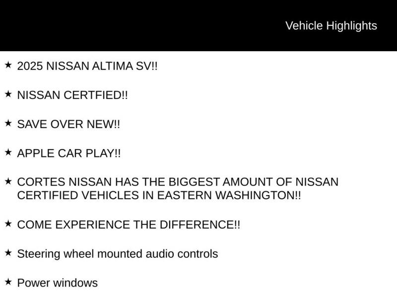 2025 NISSAN ALTIMA SV!!, NISSAN CERTFIED!!, SAVE OVER NEW!!, APPLE CAR PLAY!!, CORTES NISSAN HAS THE BIGGEST AMOUNT OF NISSAN CERTIFIED VEHICLES IN EASTERN WASHINGTON!!, COME EXPERIENCE THE DIFFERENCE!!, Bumpers: body-color, NissanConnect featuring Apple CarPlay and Android Auto, NissanConnect Services Powered by SiriusXM, Outside temperature display, Power driver seat, Power steering, Power windows, Remote keyless entry, Security system, Steering wheel mounted audio controls. Certified. Nissan Certified Details: * Limited Warranty: 84 Month/100,000 Mile (whichever occurs first) * Warranty Deductible: $100 * Roadside Assistance * Transferable Warranty * 167 Point Inspection * 7 Year/100,000 Mile Limited Warranty, 24/7 Hour Roadside Assistance, Carfax Vehicle History Report, Plus 1 Year Pre-Paid Maintenance Included. Gas Powered Nissan Models Only. * Vehicle HistoryCORTES NISSAN [phone] FAMILY OWNED AND OPERATED! COME EXPERIENCE THE DIFFERENCE!! All vehicles New and Pre-owned are one of each. All Pre-Owned or Certified vehicles are Used. A dealer documentary service fee of up to $200 may be added to the sale price or capitalized cost. All financing is subject to credit approval. Prices exclude tax, title, and license. All transactions are negotiable including price, trade allowance, interest rate (of which the dealer may retain a portion), term, and documentary service fee. Any agreement is subject to execution of contract documents. Every reasonable effort is made to ensure the accuracy of this data. Please verify any information in question with a dealership sales representative.