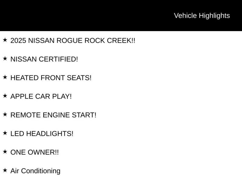 2025 NISSAN ROGUE ROCK CREEK!!, NISSAN CERTIFIED!, HEATED FRONT SEATS!, APPLE CAR PLAY!, REMOTE ENGINE START!, LED HEADLIGHTS!, ONE OWNER!!, 4-Wheel Disc Brakes, ABS brakes, Air Conditioning, Android Auto and Apple CarPlay, Auto High-beam Headlights, Automatic temperature control, Delay-off headlights, First Aid Kit, Front dual zone A/C, Fully automatic headlights, Heated door mirrors, Outside temperature display, Overhead console, Passenger vanity mirror, Power door mirrors, Power driver seat, Power steering, Power windows, Rear seat center armrest, Remote keyless entry, Rock Creek All-Season 1-Piece Cargo Area Protector with Floor Liners, Roof rack, Tachometer. Certified. Nissan Certified Details: * Roadside Assistance * Warranty Deductible: $100 * Limited Warranty: 84 Month/100,000 Mile (whichever occurs first) * Vehicle History * 167 Point Inspection * 7 Year/100,000 Mile Limited Warranty, 24/7 Hour Roadside Assistance, Carfax Vehicle History Report, Plus 1 Year Pre-Paid Maintenance Included. Gas Powered Nissan Models Only. * Transferable WarrantyCORTES NISSAN [phone] FAMILY OWNED AND OPERATED! COME EXPERIENCE THE DIFFERENCE!! All vehicles New and Pre-owned are one of each. All Pre-Owned or Certified vehicles are Used. A dealer documentary service fee of up to $200 may be added to the sale price or capitalized cost. All financing is subject to credit approval. Prices exclude tax, title, and license. All transactions are negotiable including price, trade allowance, interest rate (of which the dealer may retain a portion), term, and documentary service fee. Any agreement is subject to execution of contract documents. Every reasonable effort is made to ensure the accuracy of this data. Please verify any information in question with a dealership sales representative.