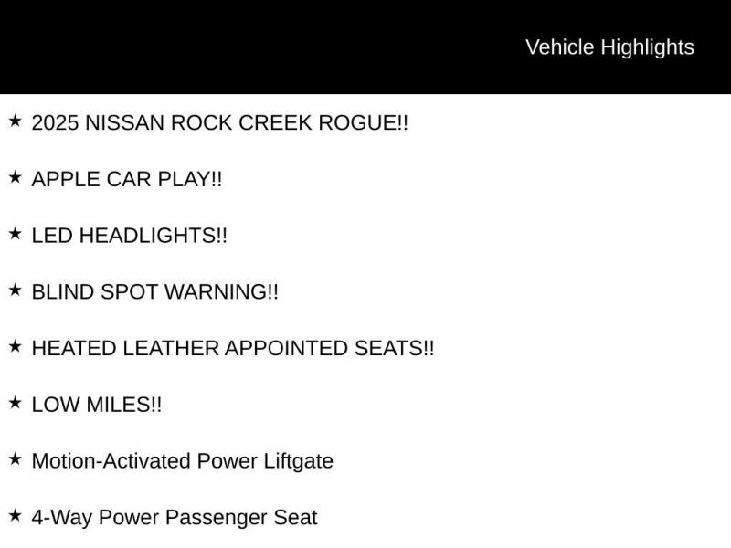 - Description2025 NISSAN ROCK CREEK ROGUE!!, APPLE CAR PLAY!!, LED HEADLIGHTS!!, BLIND SPOT WARNING!!, HEATED LEATHER APPOINTED SEATS!!, LOW MILES!!, 4-Way Power P...